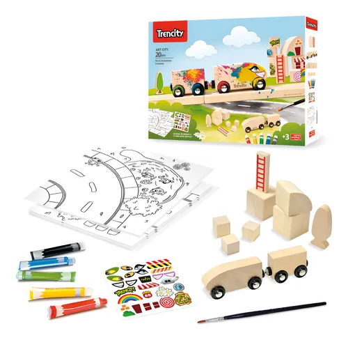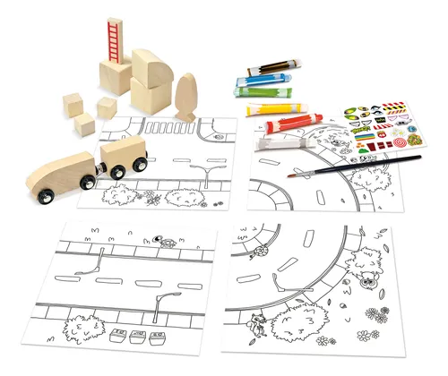 Incluye pincel, 6 temperas surtidas, 4 hojas con temática de calles, 2 vehículos de madera maciza imantados, 8 bloques de madera maciza, 1 plancha de 28 stickers para personalizar.