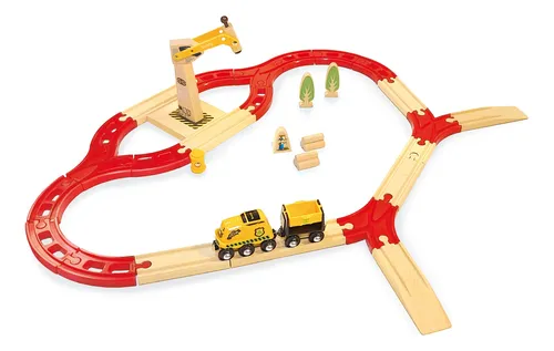 Incluye: 10 curvas cortas, 6 rectas, 4 desvíos, 1 mini recta, 2 rampas, 1 Grúa Magnética, 1 Locomotora Benny, 1 vagón de carga con barril, 2 leños, un personaje y 2 árboles.