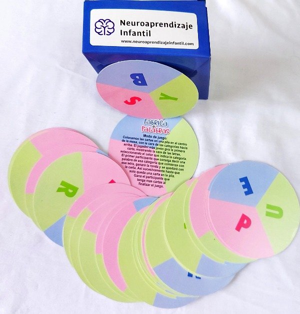 Contiene 30 cartas e instrucciones. ¿Cómo se juega? Colocamos las cartas en una pila el centro de la mesa, con la cara de las categorías hacia arriba. El jugador más joven gira la primera carta mostrando la cara de las letras, seleccionando el color que indica la categoría. El primer participante que consiga decir una palabra de esa categoría que comience con esa letra, ganará la ronda y se quedará con la carta. Así sucesivamente hasta que se terminen las cartas. Gana el jugador que tenga más cartas en su poder.