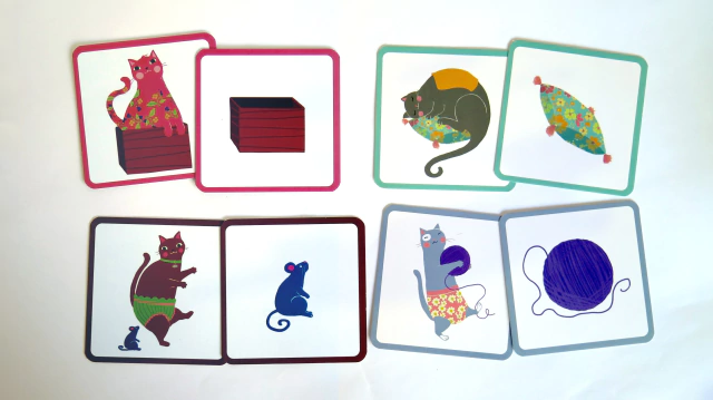 Juego de 24 cartas para juntar 12 pares de gatitos con sus objetos.