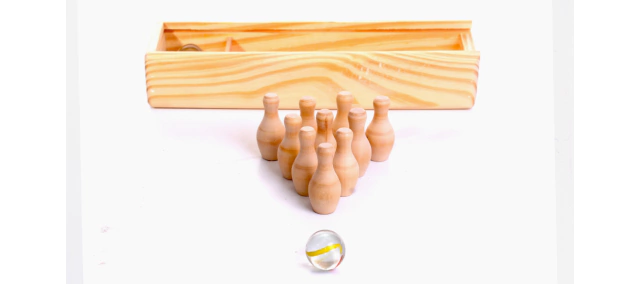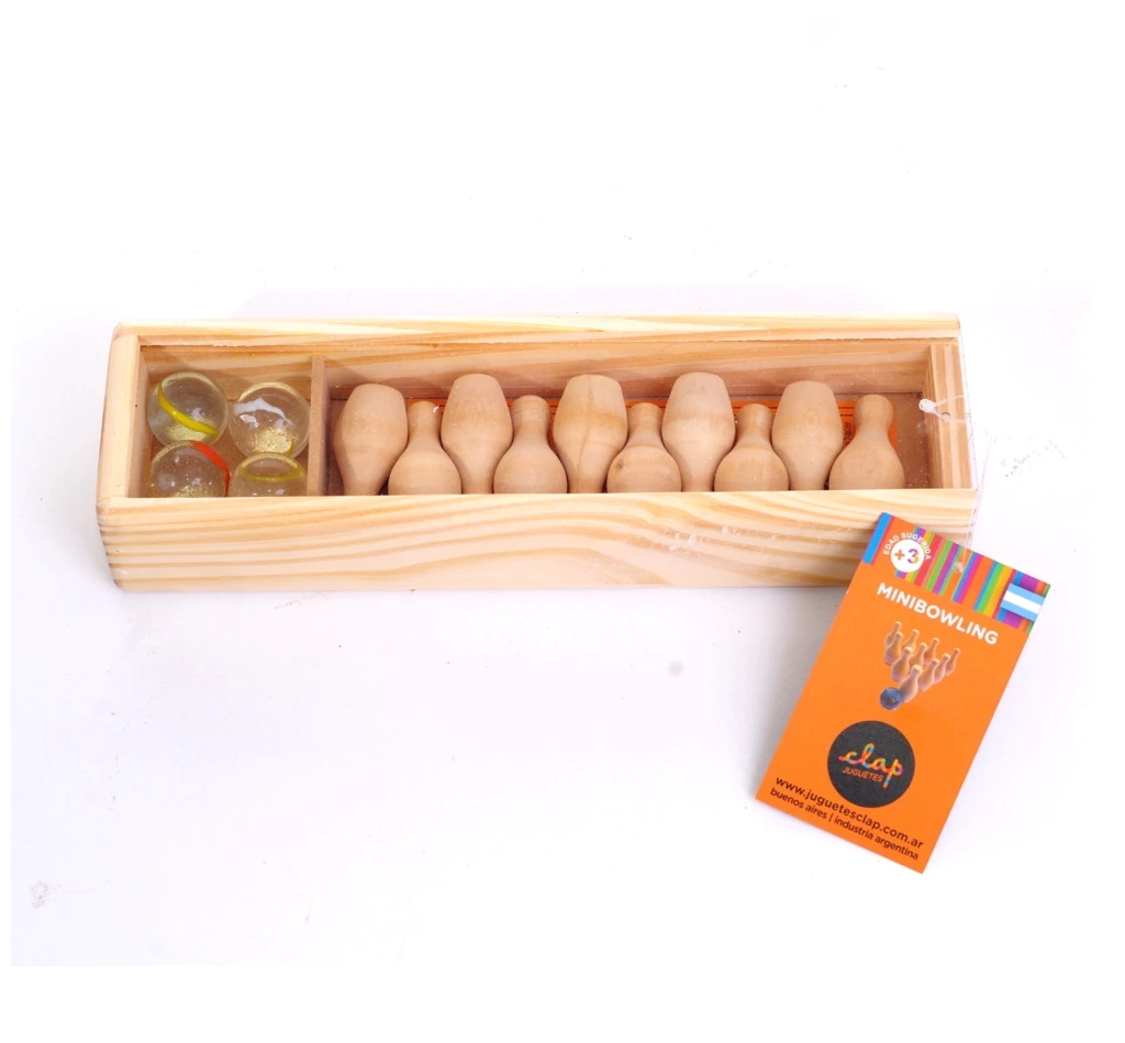 Caja con 10 palos de minibowling y 4 canicas que permiten jugar al bowling en cualquier espacio.